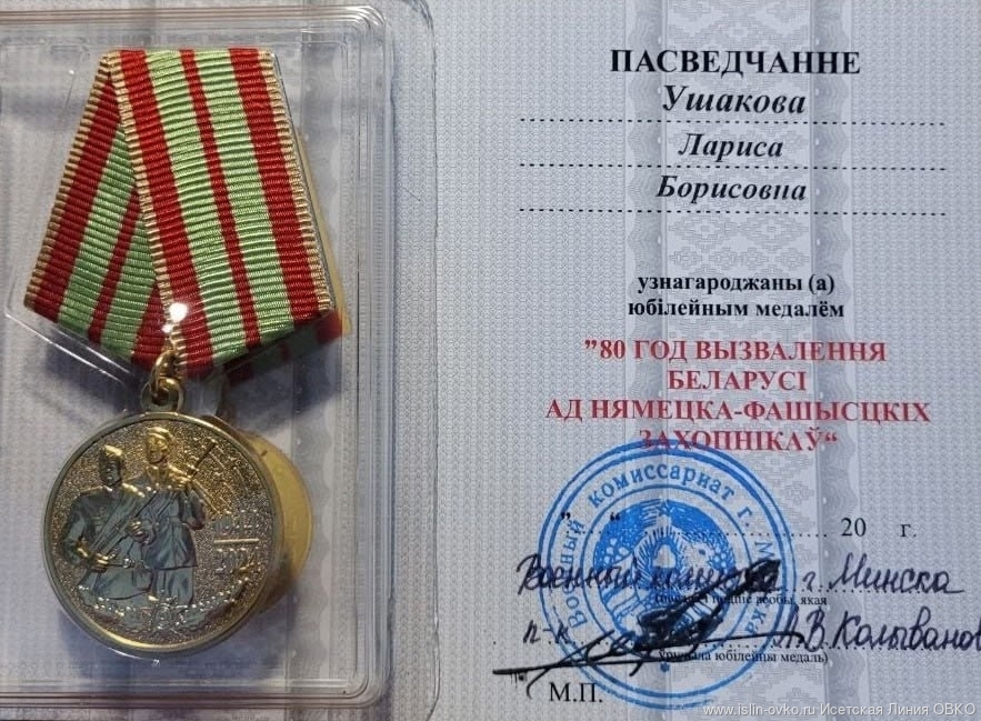 Советник атамана по культуре ЕОКО «Исетская линия» Лариса Ушакова награждена юбилейной медалью «80 лет освобождения Беларуси от немецко-фашистских захватчиков».